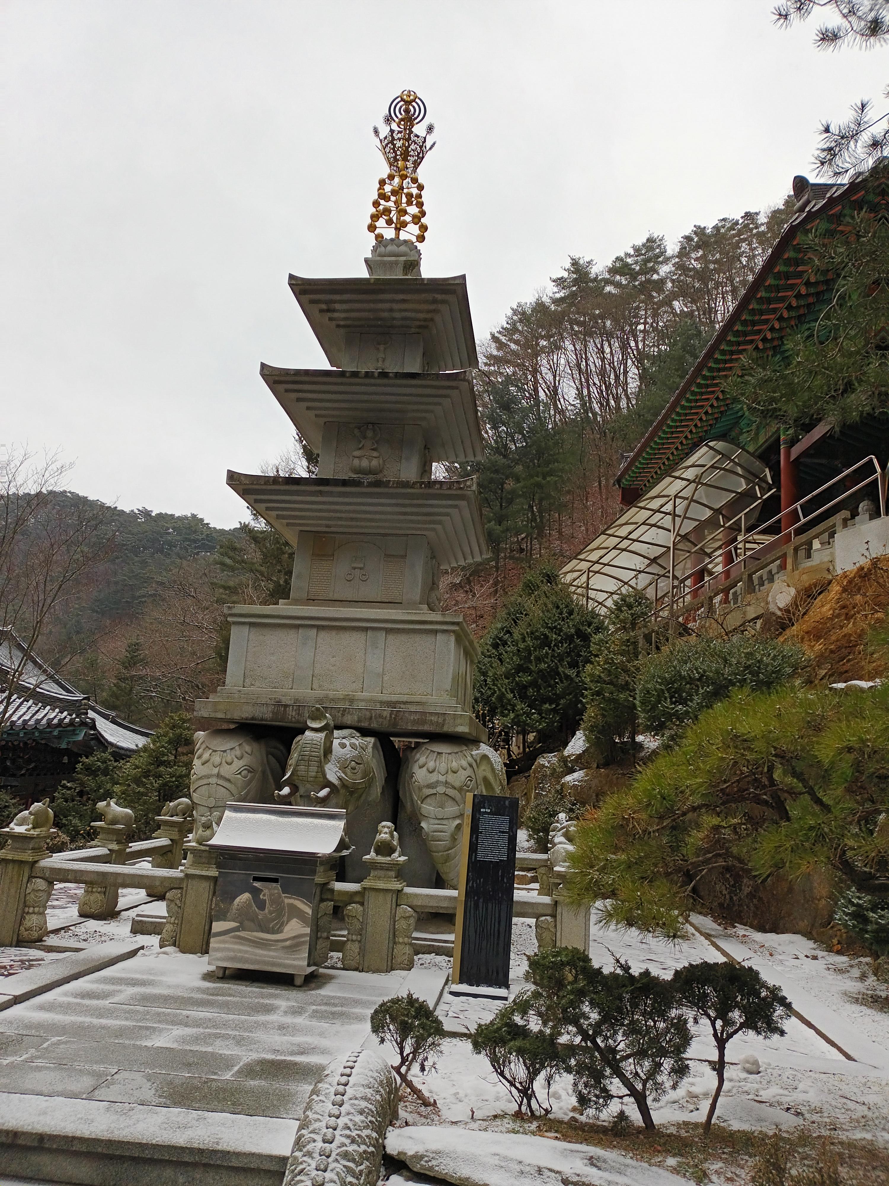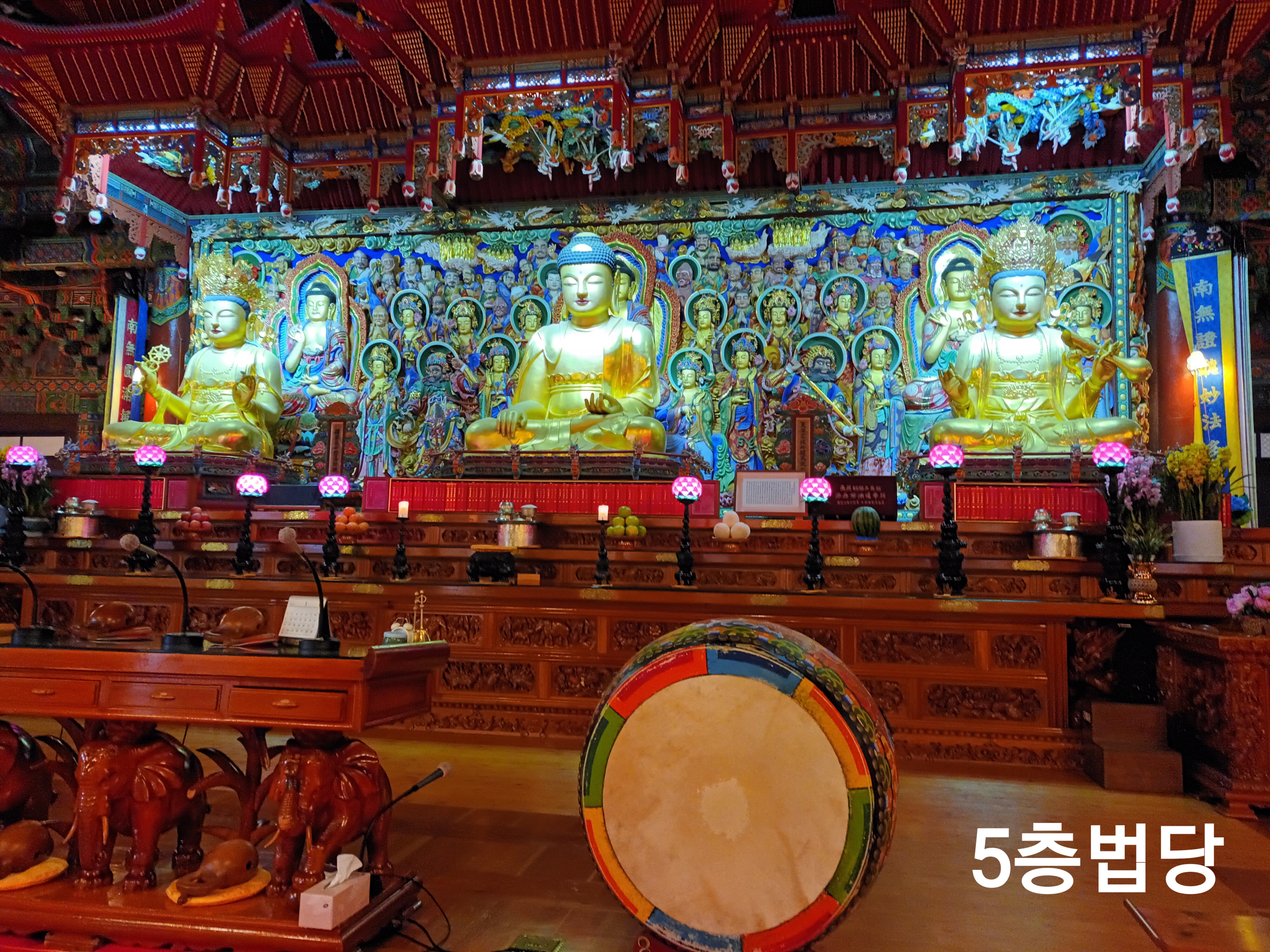 서 있고 이문을 지나면 건축물들이 좌, 우로 들어서 있는데 중간에 옛날 초막이 있던곳에 5층 법당
