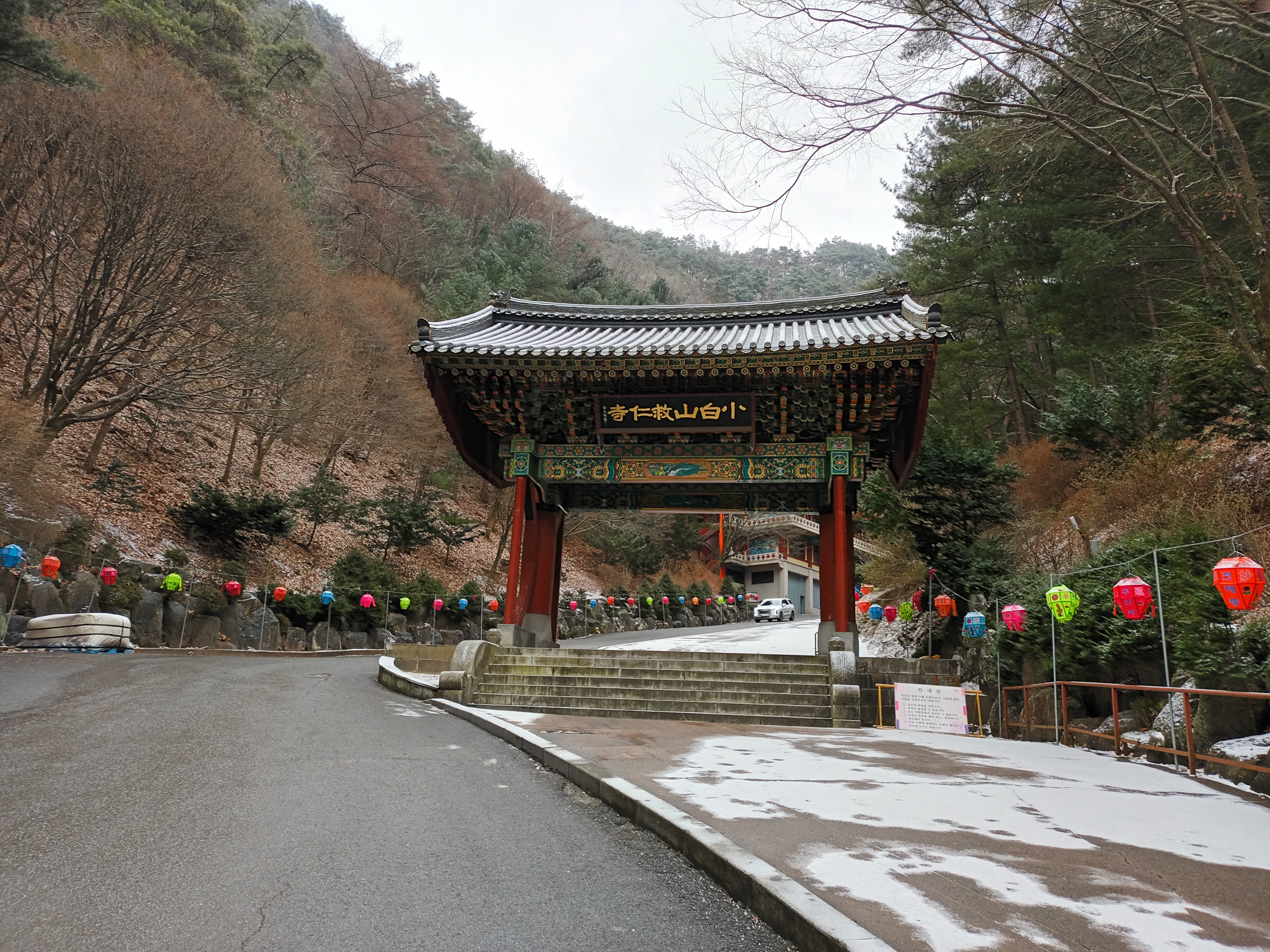 바로 앞에 일주문이 보인다. 여기서부터 구인사 건축물들이 시작된다.