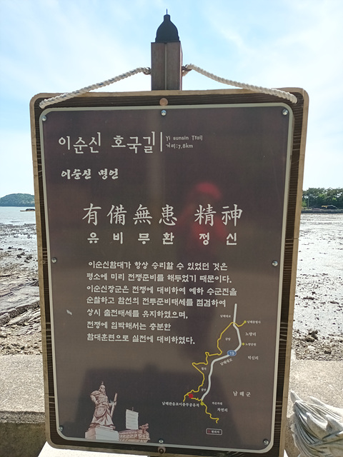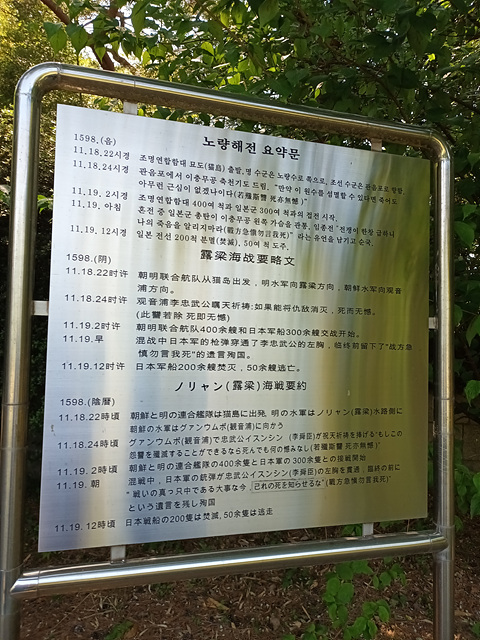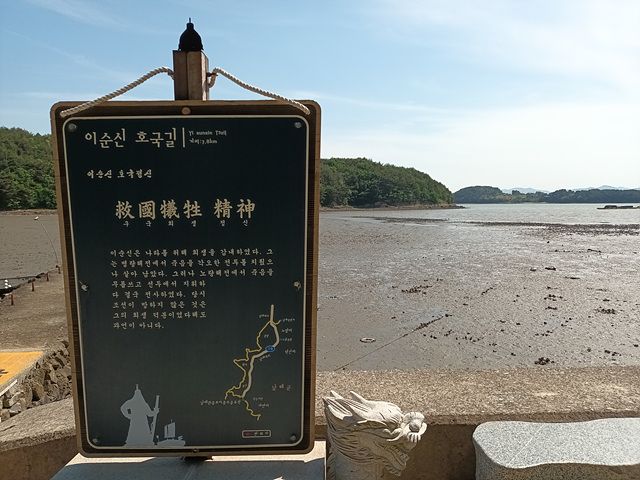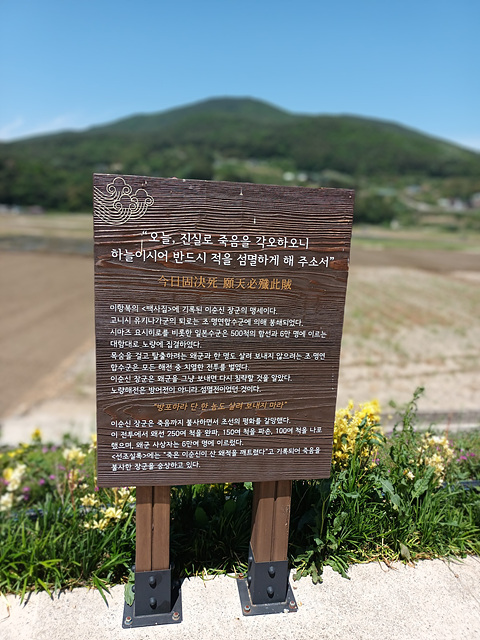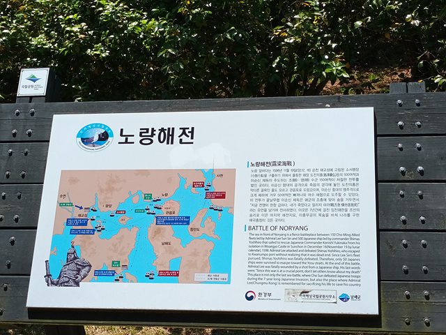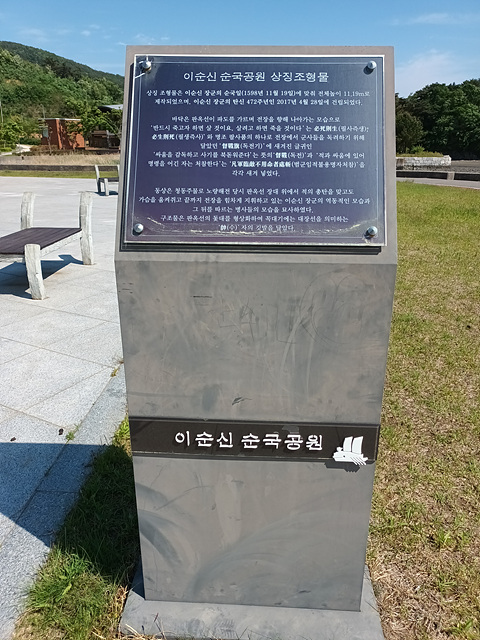이 전투가 끝날무렵 이순신 제독은 왜군의 조총에 맞아 숨을 거두면서 "지금 전쟁이 급하다. 내가 죽었다고 알리지 마라.(戰方急 愼勿言我死 전방급 신물언아사)" 라는 유언을 남기며 전사하였다. 이곳은 7년간에 걸친 임진왜란을 조선의 승리로 이끈 마지막 해전이요. 이충무공이 목숨을 바쳐 나라를 구한 애국충정이 깃든 곳이다.