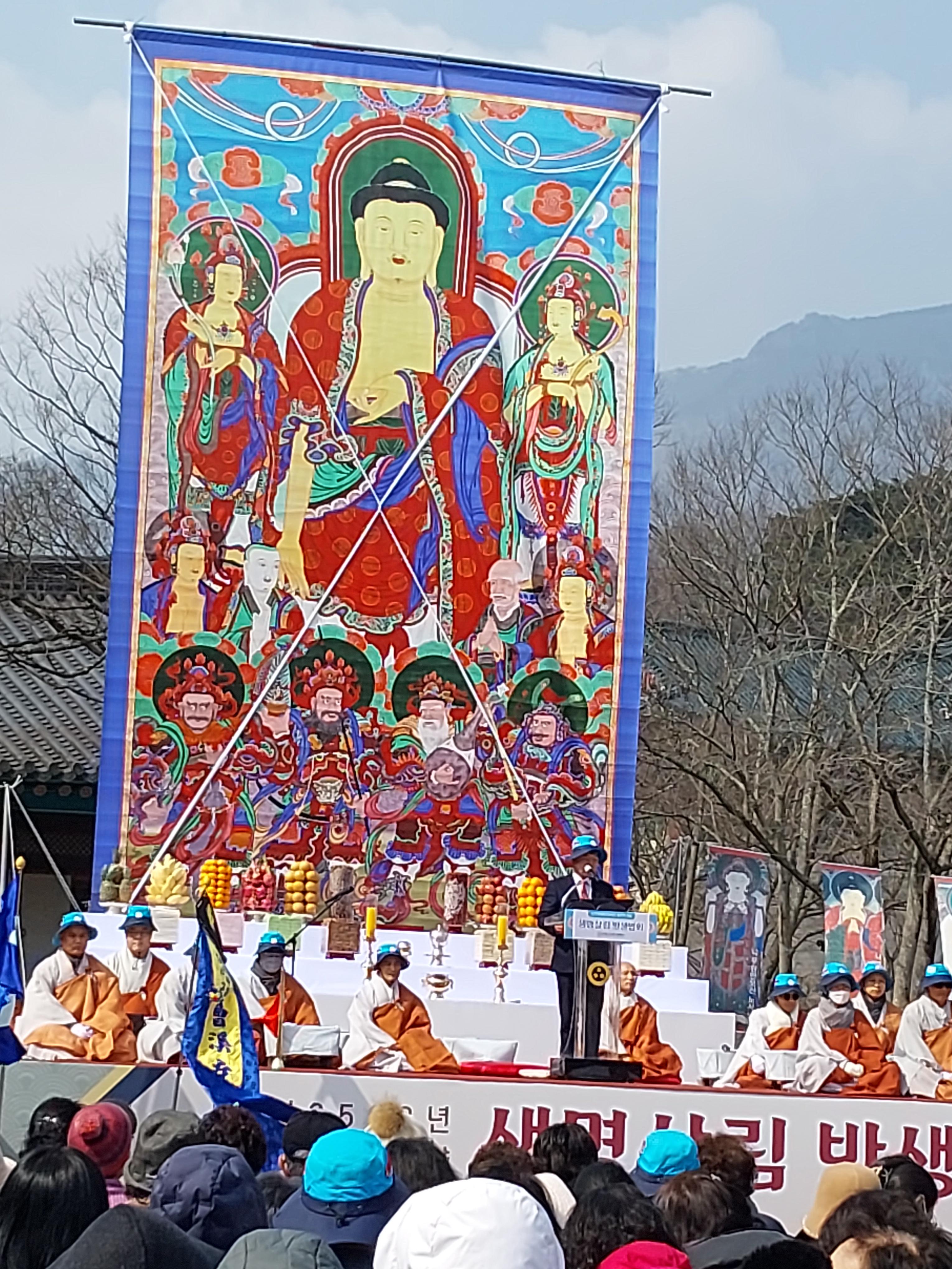 식순은 신묘장구대다라니 상단불공 방생기도 법문(대한불교조계종 종정예하성파스님) 내빈소개 및