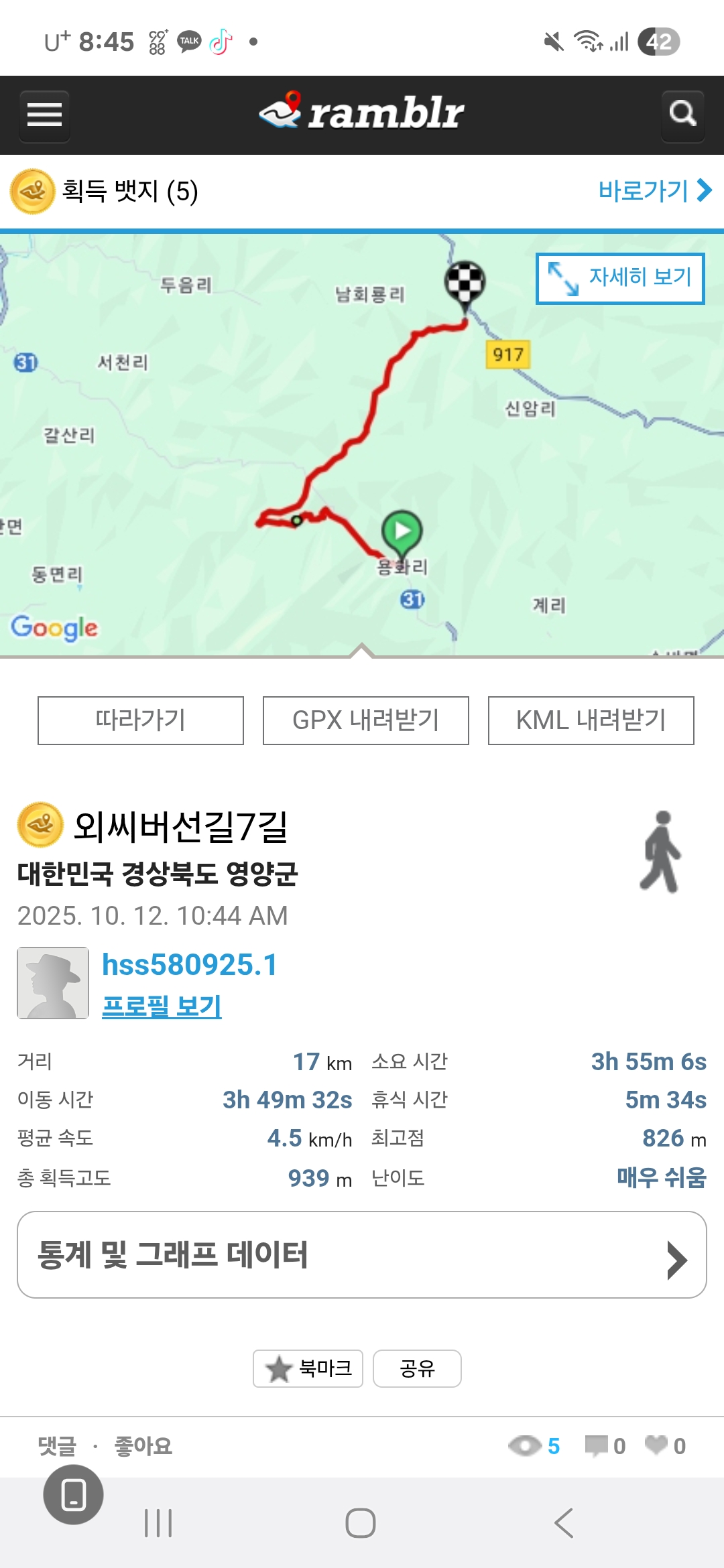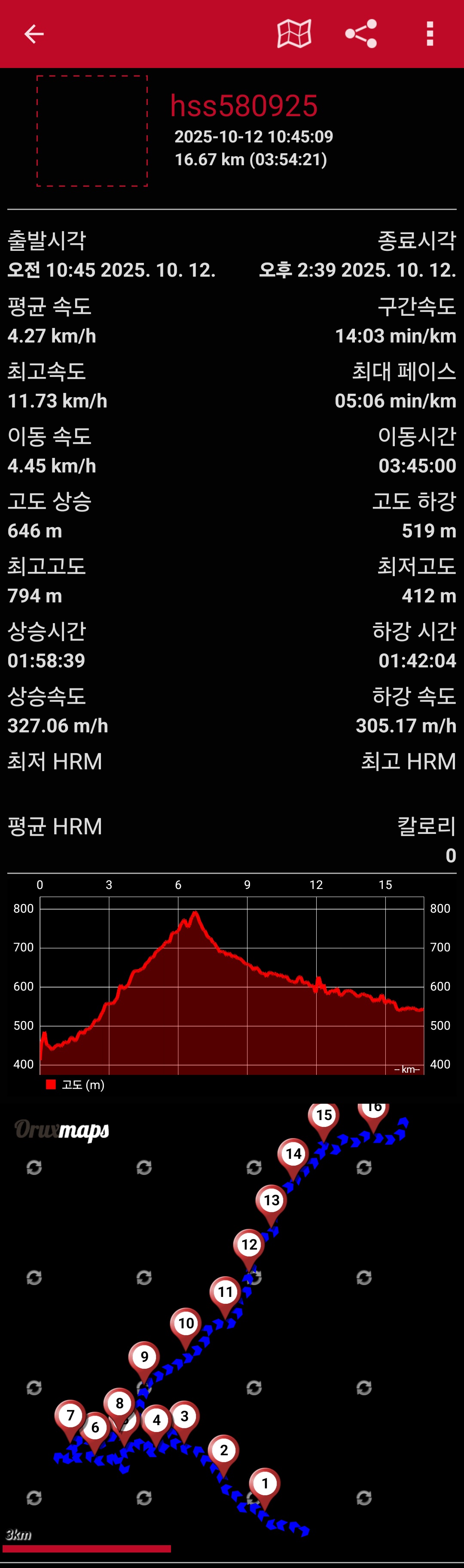 거 리 : 16.67㎞ (03:54:21 소요됨)