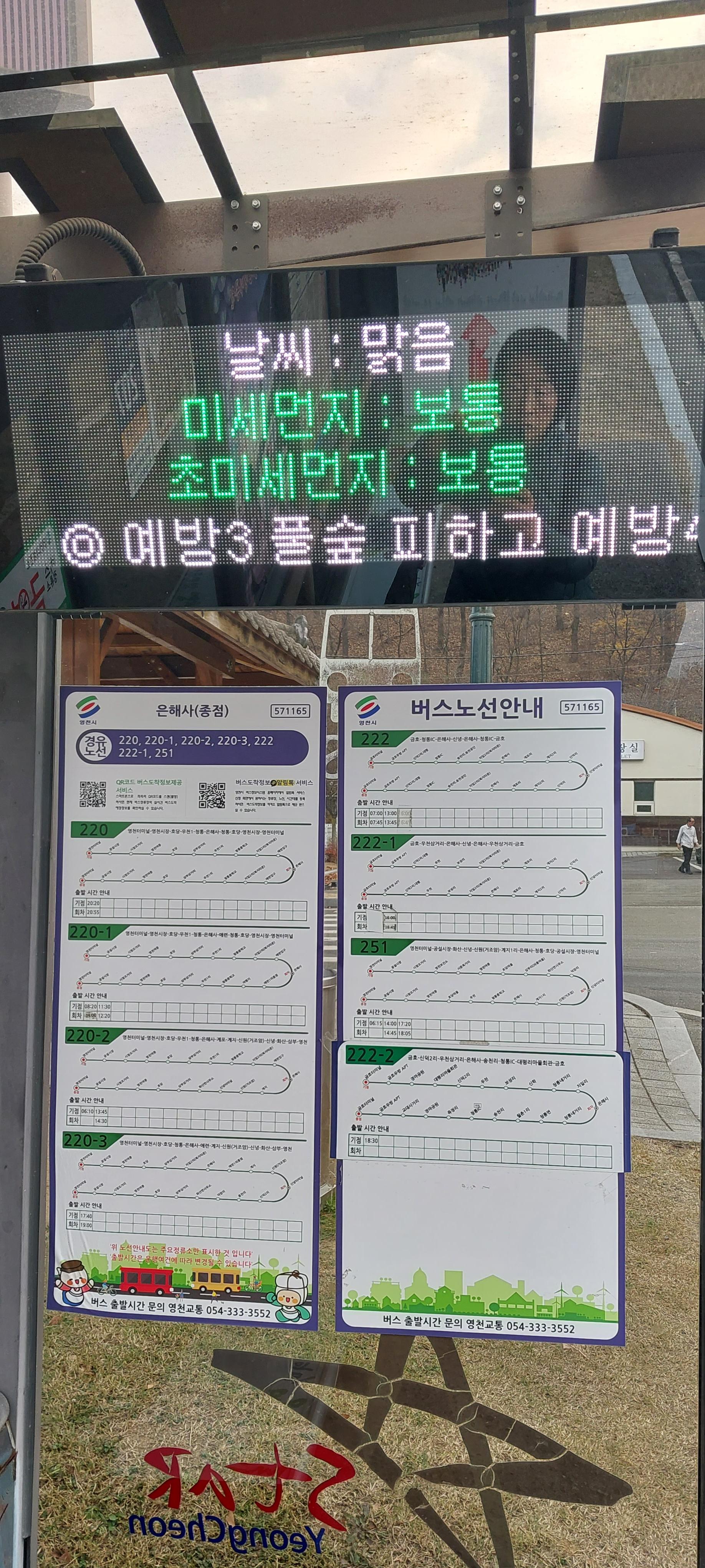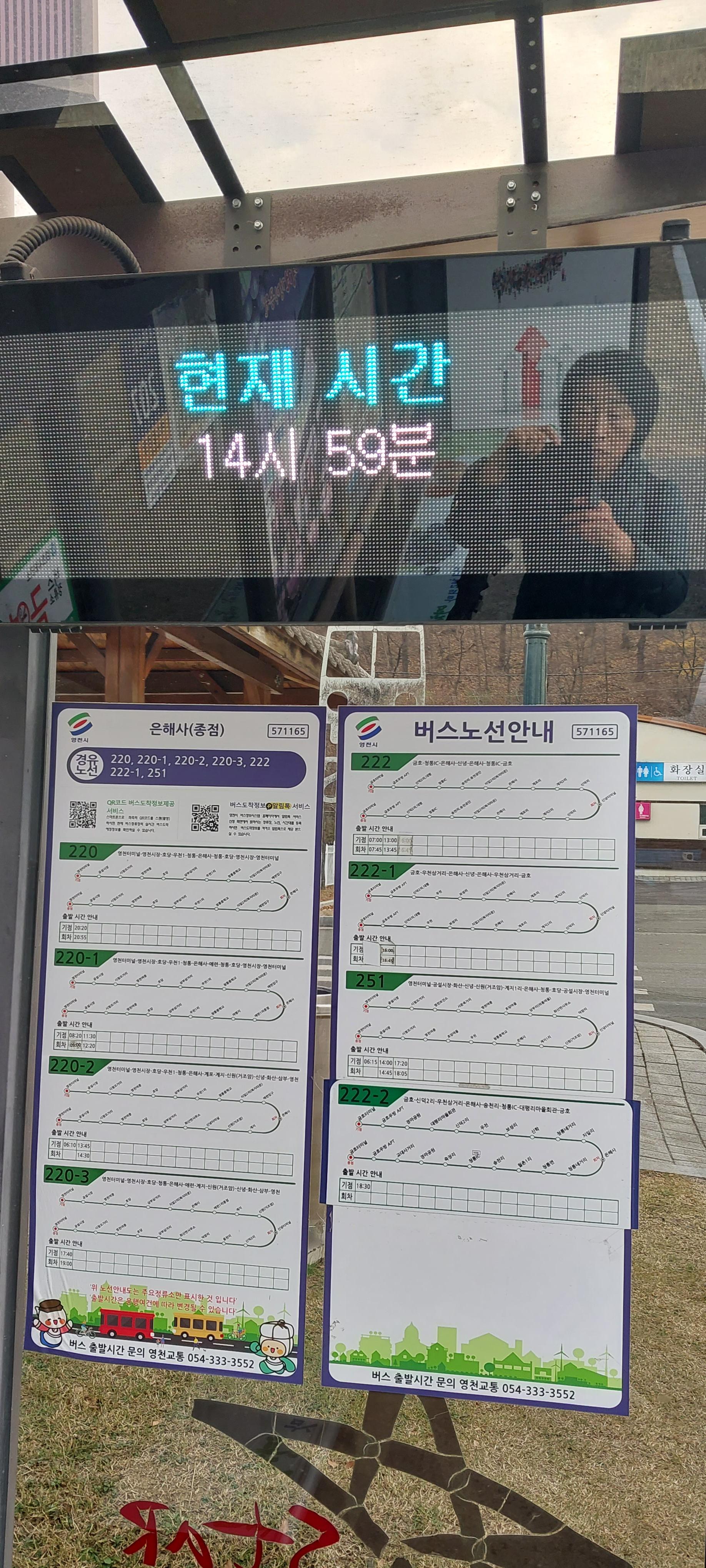 (11:30)영천터미널 출발 (220-1번 버스) - (12:20)은해사 정류장 도착