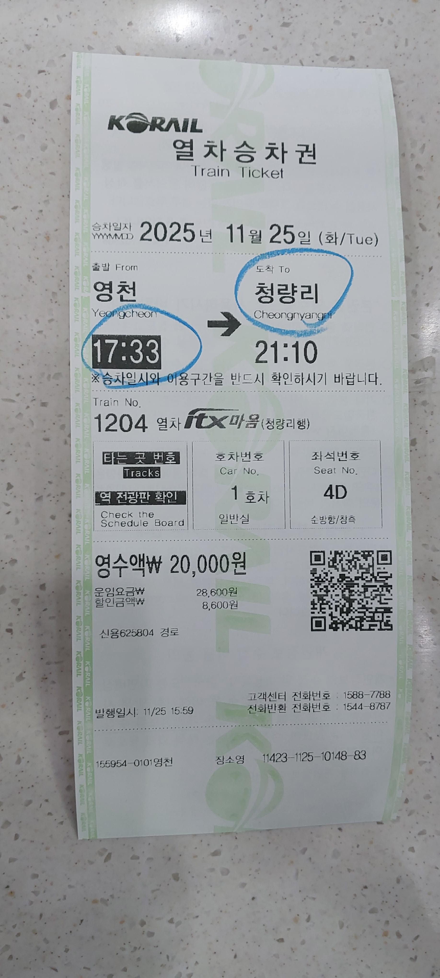 서울행 기차표 끊음(17:33분출발) , 저녁 굴국밥(8,000원) - 밤 21:10 청량리 도착