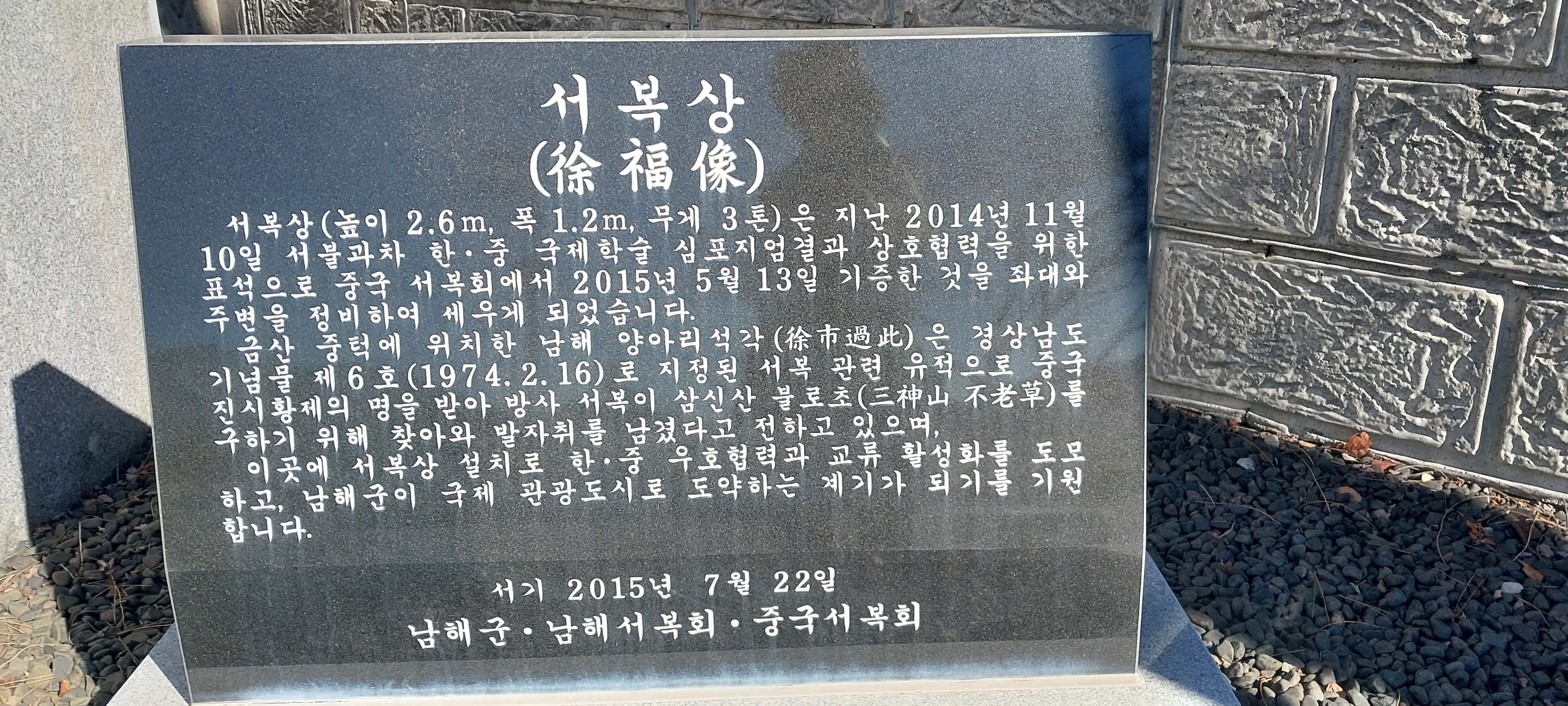 천하를 통일한 주국 진시황이 방사 서불에게 삼신산 불로초를 수해 오라 명하여 서물이 산 넘고 물 건너 남해 ㄱㅁ산까지 찾아 왔지만 불로초는 구하지 못하고 한동안 사냥만 즐기다가 금산을 떠나 면서 바위위에 글을 새겨 발자취를 남겼다고 전하는 남해 양아리 석각(徐市過此)은 경상남도 기념물 제6호(1974,02, 16)로 지정되어 금산 중턱에 자리 잡고 있습니다. 후대인들은 해독하지 못한 서불 관련 남해 암각화를 여러형태로 분석하고 있습니다. "남해도"의 저자 이청기는 거란족문자 설, 인도의 데세판데 박사는 수렵선각설, 최남선은 고대문자설, 정인보는 선사시대 각석설, 한국정신 문화연구원에서는 신사석각화설, 오세창은 중국의 금석학자 하주도가 해석한 서불기래 일출 설을 주장하고 있으나 ㅏ직까지 어떤 내용인지 정확하게 밝혀지지 않고 있습니다.여기 서복상은 ㅜㅇ국 서복회에서 기증 하였으며 서복이 그 옛날 서복과차를 새긴 곳에 설치되어 그 의미가 매우 큽니다.